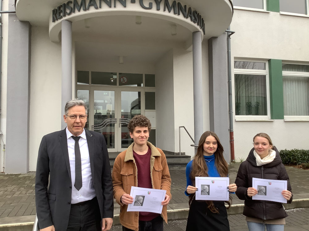 Dass wir nicht davon abhängig sind, dass Texte nur noch durch künstliche Intelligenzen verfasst werden, sondern auch unsere menschliche Intelligenz argumentative Beiträge zu grundlegenden Fragen formulieren kann, haben Violetta Globetanz und Marek Heggemann aus der Einführungsphase sowie Lana-Lea Fabianski (Q1) bewiesen. Sie haben erfolgreich am Landes- und Bundeswettbewerb philosophischer Essay teilgenommen und am 05.02.2026 aus der Hand des Schulleiters Siegfried Rojahn Urkunde erhalten. Damit hebt die Jury des Wettbewerbs die Exzellenz ihrer Essays hervor.