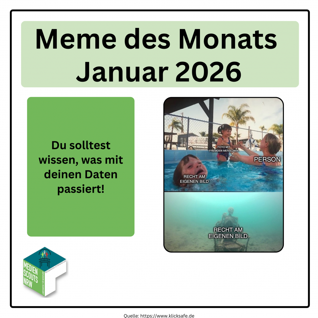 Unser Meme des Monats zeigt diesen Monat, wie das Recht am eigenen Bild im digitalen Alltag oft untergeht, besonders in Zeiten von Social Media, Gruppenfotos und viralem Content. Während eine Person fröhlich im Mittelpunkt steht und das Foto mit fremden Menschen sorglos mitschwimmt, geht das Recht am eigenen Bild buchstäblich unter. Laut einer Studie des Bundesverbands für digitale Selbstbestimmung wissen weniger als 40 % der Jugendlichen, dass sie der Veröffentlichung ihres Bildes zustimmen müssen, selbst bei harmlos wirkenden Gruppenfotos.