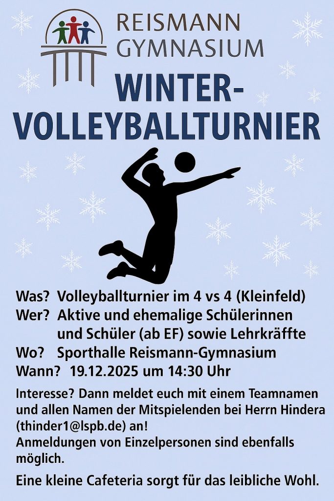 Am Ende des Kalenderjahres findet eine Premiere statt: Die Fachschaft Sport organisiert erstmalig ein Volleyballturnier für aktive und ehemalige Schülerinnen und Schüler sowie für aktive und ehemalige Lehrkräfte. An einem Nachmittag sollen dabei vor allem Geselligkeit und Spaß im Vordergrund stehen, der Ehrgeiz und Wettkampfcharakter aber auch nicht zu kurz kommen.